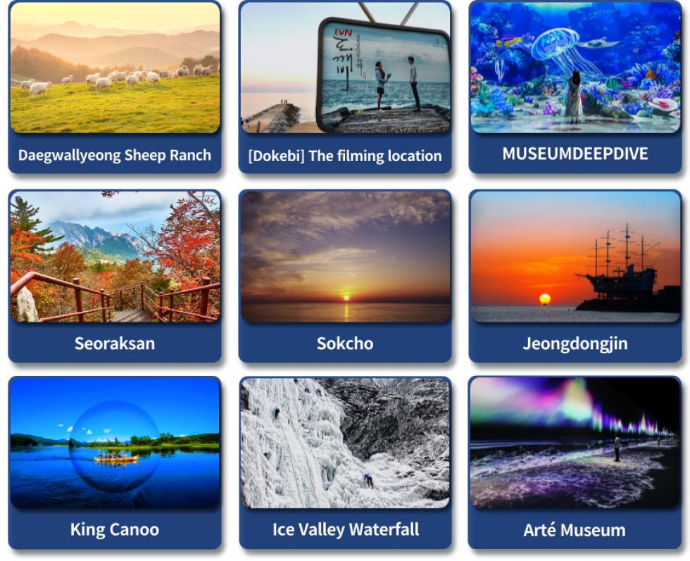 江原道豪华探索之旅邀请您探索东海岸隐藏的宝藏。从充满活力的束草市到令人惊叹的雪岳山,本次旅行提供精心策划的行程,展示该地区最具标志性的景点。凭借更加奢华的高级巴士交通,您一定能深入探索江原道丰富的历史和自然美景。无论您是惊叹于原始海滩还是沉浸在当地文化中,这次旅行都将给您带来难忘的冒险之旅。
